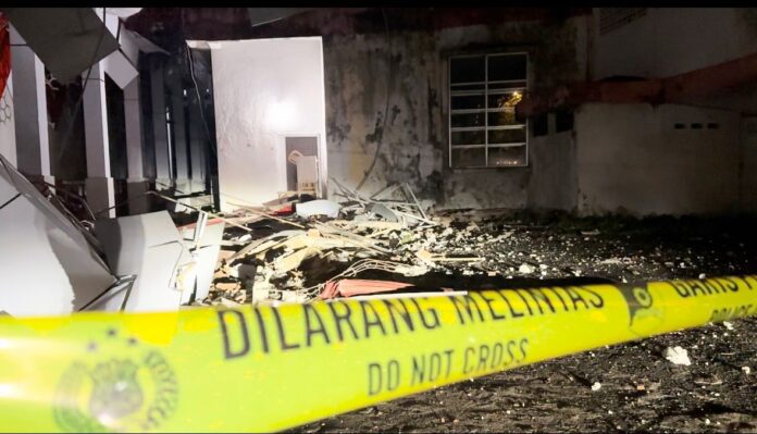 Puing-puing Asesoris Hall B GOR KONI Sulut yang berserakan di area gedung akibat gempa magnitudo 5,9 SR yang terjadi, Senin (11/9/2023) malam. (foto: KONI Sulut)