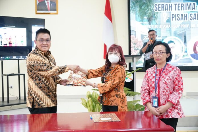 Direktur Utama yang lama, Dr dr Jimmy Panelewen SpB-KBD yang sudah dilantik Menteri Kesehatan RI Budi Gunadi Sadikin sebagai Direktur Utama RSUP Dr Hasan Sadikin Bandung kepada Plt Direktur Utama RSUP Kandou Manado, Dr dr Ivonne Elisabeth Rotty MKes.