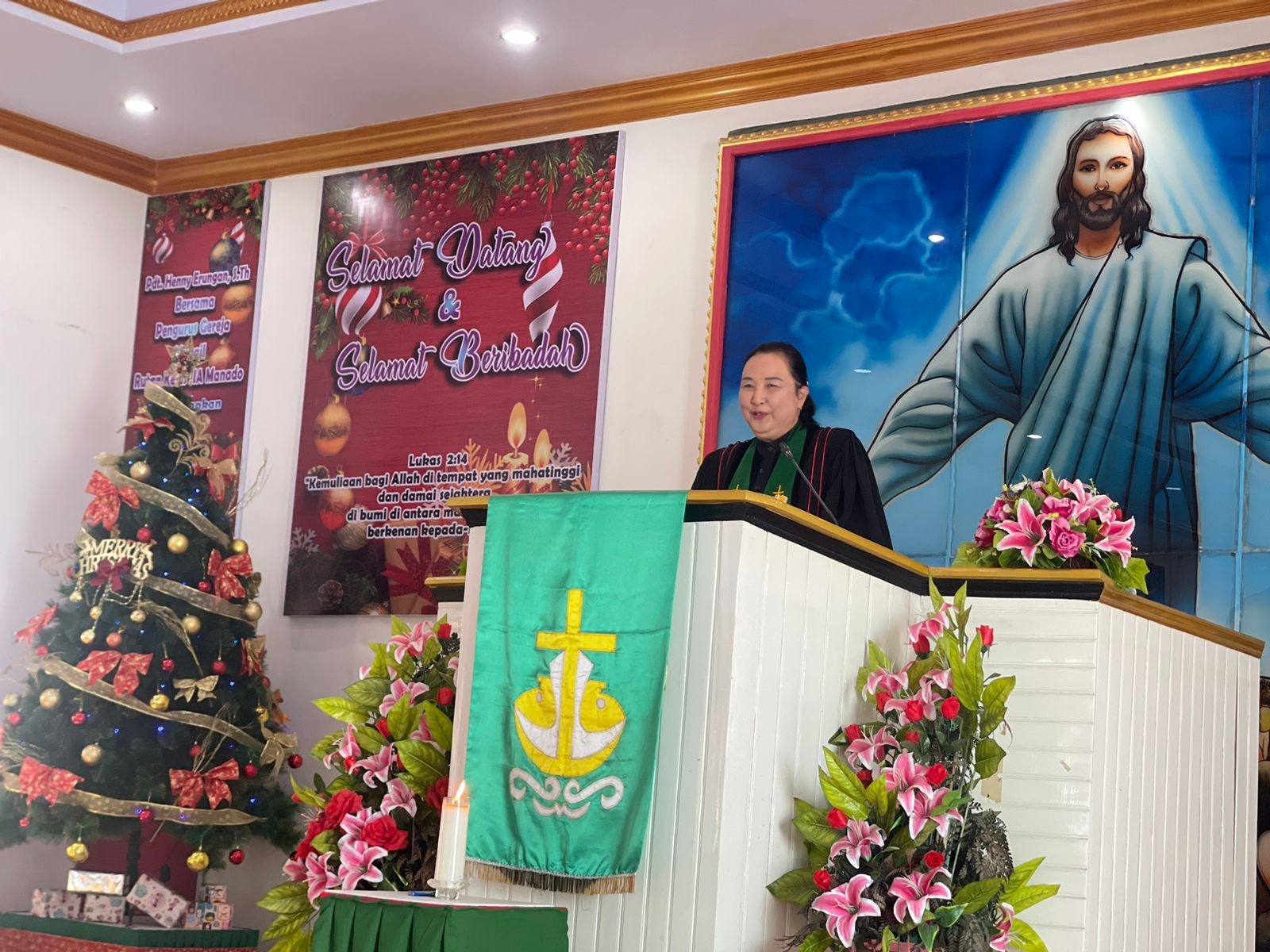 Pendeta Pelayanan GMIM yang ditempatkan Sinode GMIM di Gereja Abigail, Pdt Henny Lenny Martha Erungan, STh menjadi Khadim dalam pelaksanaan ibadah ditengah cuaca mendung tersebut.