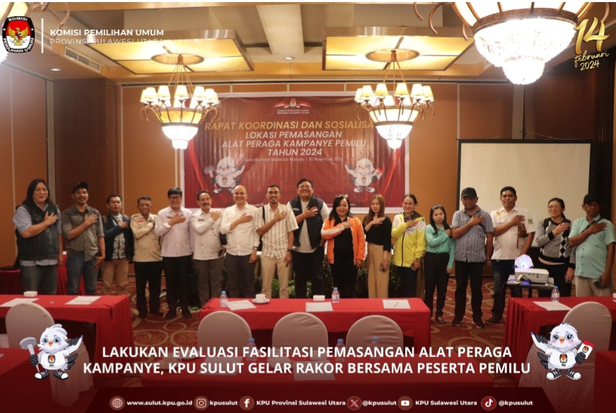 MANADO – KPU Sulut melakukan Rapat Koordinasi (Rakor) bersama Partai Politik Peserta Pemilu, Tim Kampanye Daerah (TKD) Calon Presiden dan Wakil Presiden dan Calon Anggota DPD Daerah Pemilihan Sulawesi Utara di Swis BellHotel Manado, (30/11/2023).