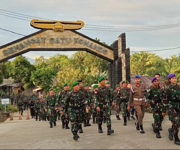 MANADO – Komandan Kodim 1309/Manado Kolonel Inf Himawan Teddy Laksono SIKom MTr (Han) mengikuti jalan bersama Peleton Beranting Yudha Wastu Pramuka Jaya (YWPJ) menuju Mayonif 712/WT.