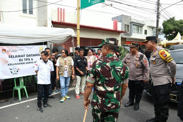 MANADO – Kapolda Sulut Irjen Pol Yudhiawan didampingi Danrem 131/Santiago Brigjen TNI Wakhyono, Ketua Bawaslu Ardiles Mewoh dan sejumlah pejabat TNI-Polri melakukan patroli pengecekan kegiatan pemungutan suara di wilayah Kota Manado, Tomohon dan Minahasa, Rabu (14/2/2024).
