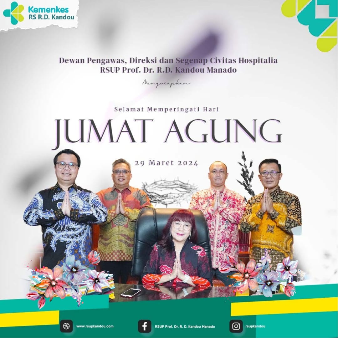 MANADO – Dewan Pengawas, Direktur Utama RSUP Prof Dr R.D Kandou Manado, Dr dr Ivonne Elisabeth Rotty MKes bersama Dewan Direksi dan civitas hospitalia rumah sakit Kandou mengucapkan selamat memperingati Hari Jumat Agung 29 Maret 2024 kepada seluruh umat Kristiani.