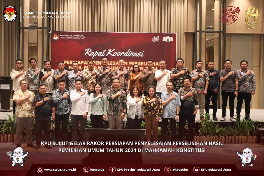 MANADO – KPU Sulut melaksanakan Rapat Koordinasi Persiapan Penyelesaian Perselisihan Hasil Pemilihan Umum (PHPU) di Hotel Luwansa mulai 21-23 April 2024.