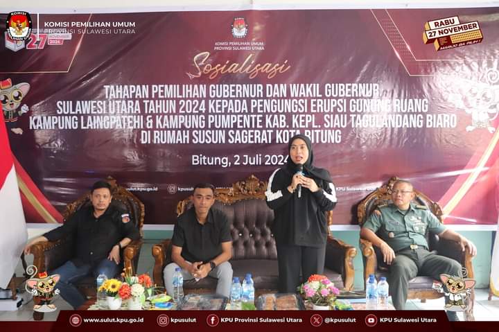 BITUNG – Komisi Pemilihan Umum (KPU) Provinsi Sulawesi Utara menggelar acara Sosialisasi Tahapan Pemilihan Gubernur dan Wakil Gubernur Sulawesi Utara Tahun 2024 kepada pengungsi erupsi gunung Ruang Kampung Laingpatehi dan Kampung Pumpente Kabupaten Kepulauan Siau Tagulandang Biaro.