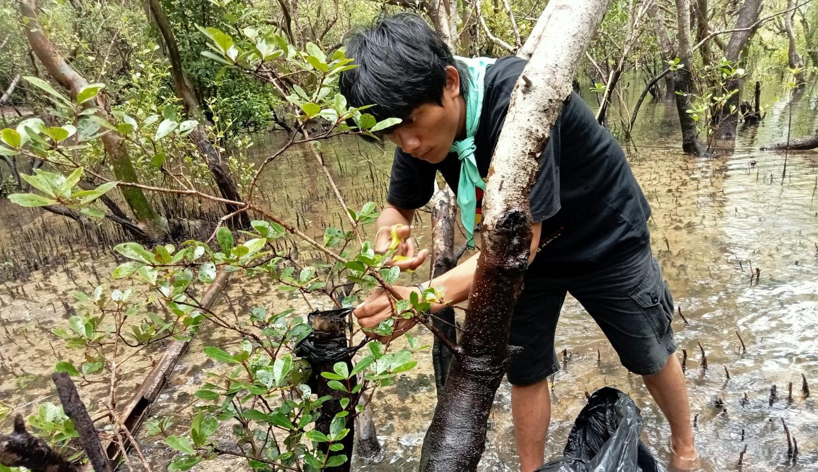 “Kami membersihkan sampah yang melingkari dahan hingga daun dari Mangrove itu sendiri,” ungkap Aldi, penanggungjawab kegiatan.