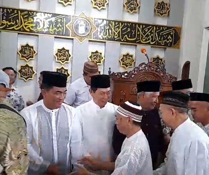 MANADO – Gubernur Sulawesi Utara Mayjen TNI (Purn) Yulius Silvanus bersama Wakil Gubernur Victor Mailangkay bersilahturahmi bersama para warga selesai Shalat Ied di Mesjid Raya Ahmad Yani, Senin (31/3/2025).