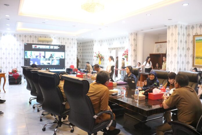 Bupati Minahasa Selatan Franky Donny Wongkar SH, Wakil Bupati Brigjen TNI (Purn) Theodorus Kawatu SIP bersama jajaran mengikuti Rapat Kordinasi secara daring oleh Kementerian Dalam Negeri RI dari Ruang Rapat Kantor Bupati Minahasa Selatan, Senin (5/5/2025).