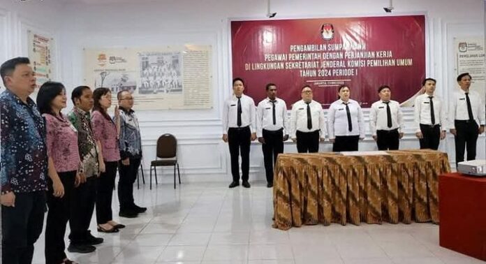 Sekretaris Jenderal KPU, Bernard Dermawan Sutrisno memimpin pengambilan Sumpah/Janji 3486 PPPK Sekretariat Jenderal KPU.