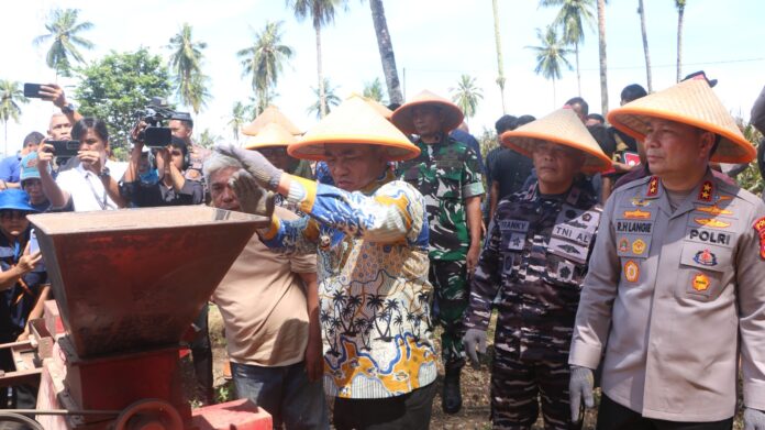 MANADO – Kapolda Sulawesi Utara (Sulut) Irjen Pol Roycke Harry Langie bersama Gubernur Sulut Mayjen TNI (Purn) Yulius Selvanus dan Forkopimda panen raya jagung serentak, di perkebunan Pandu, Kecamatan Bunaken, Kota Manado, Kamis (5/6/2025) siang.