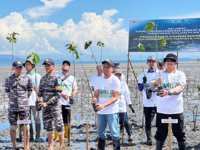 TOLITOLI – Memperingati Hari Lingkungan Hidup Sedunia, PT PLN (Persero) Unit Pelaksana Pelayanan Pelanggan (UP3) Tolitoli bersama Pemerintah Daerah Kabupaten Tolitoli, Lanal Tolitoli, dan sejumlah instansi terkait menggelar aksi penanaman 5.000 pohon mangrove di wilayah pesisir Kabupaten Tolitoli, Sabtu (28/06).