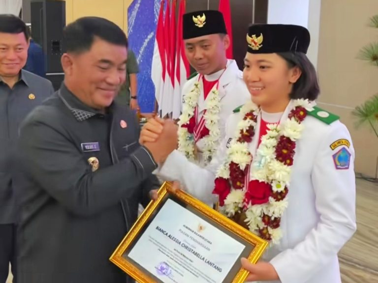 MANADO – Gubernur Sulawesi Utara Yulius Selvanus bersama Wakil Gubernur Victor Mailangkay dengan bangga menyambut Bianca Alessia Christabella Lantang, siswi SMA Lentera Harapan Tomohon dan Firji Beeg, siswa SMA Negeri 1 Kotabunan, dikantor gubernur Jumat (22/08/2025).