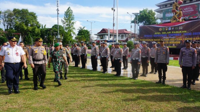 Kegiatan Apel gelar pasukan operasi Lilin Tahun 2023 dilaksanakan di lapangan Sparta Tikala, Kota Manado, Kamis (21/12/2023).