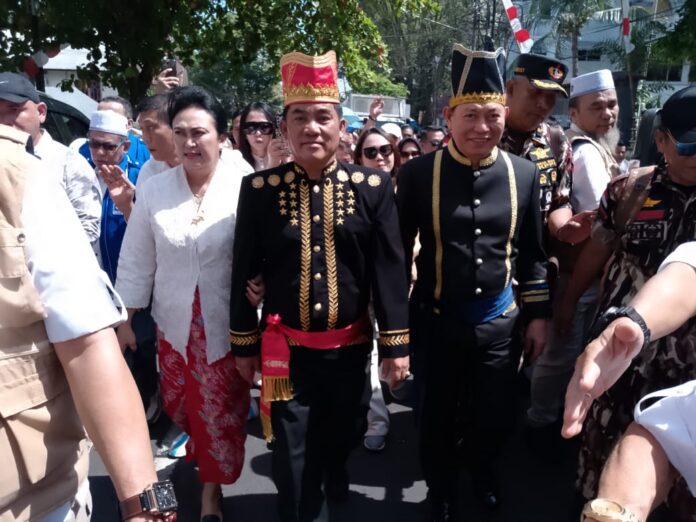 Dengan diantar ribuan pendukung dan pengurus partai pasangan YSK-VM yang memakai baju adat Minahasa datang membawa Dukungan B1 KWK partai pendukung.
