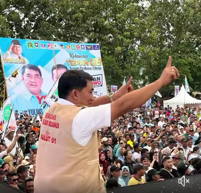 KOTAMOBAGU – Calon Gubernur Sulawesi Utara nomor 1 Yulius Selvanus Komaling (YSK) yang berkampanye di Lapangan Molinouw, Kota Kotamobagu Sulawesi Utara, Sabtu (12/10/2024)