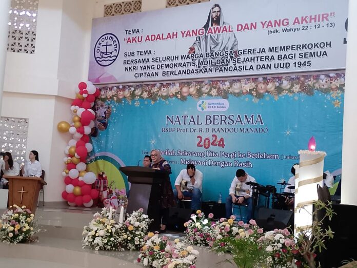 MANADO – Rumah Sakit Prof Dr RD Kandou Manado menggelar ibadah Natal yang dihadiri oleh pegawai dan pasien serta para undangan, yang di gelar di Gereja Oikumene Lukas, Rabu (18/12/2024).