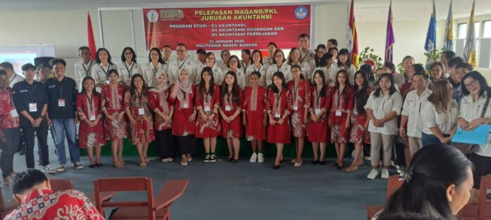 MANADO – Direktur Politeknik Negeri Manado (Polimdo) Dra Maryke Alelo MBA melepas para mahasiswa Praktek Kerja Lapangan (PKL) di gedung pusat administrasi, Jumat (31/01/2025).