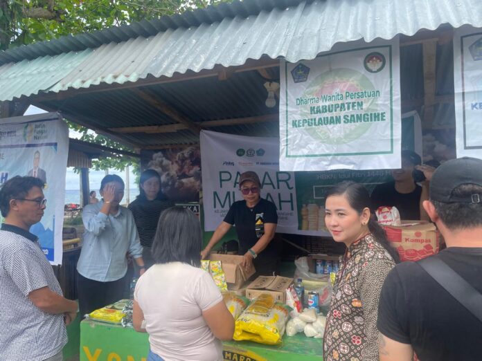 SANGIHE – Ketua Tim Penggerak PKK Kabupaten Kepulauan Sangihe, Ny Cherry S. Thungari Soeyoenus SE bersama Wakil Ketua Ny Agnes Bulahari Walukow SE melakukan peninjauan langsung ke Gerakan Pangan Murah yang diselenggarakan Pemerintah Kabupaten Sangihe di Kompleks Posad Kawaluso, Sabtu (22/03/2025).