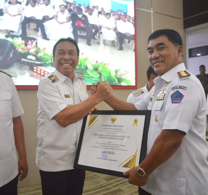 Piagam Penghargaan tersebut diterima Bupati Minahasa Selatan Franky Donny Wongkar SH yang diserahkan Gubernur Sulawesi Utara Mayjen TNI (Purn) Julius Selvanus SE pada kegiatan Kawin Massal di Aula Mapalus, Rabu (30/04/2025).