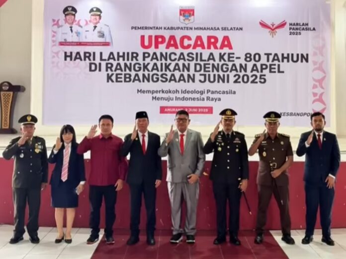 Upacara itu dirangkaikan dengan Apel Kebangsaan Juni 2025 di Aula Waleta Kantor Bupati Minahasa Selatan.