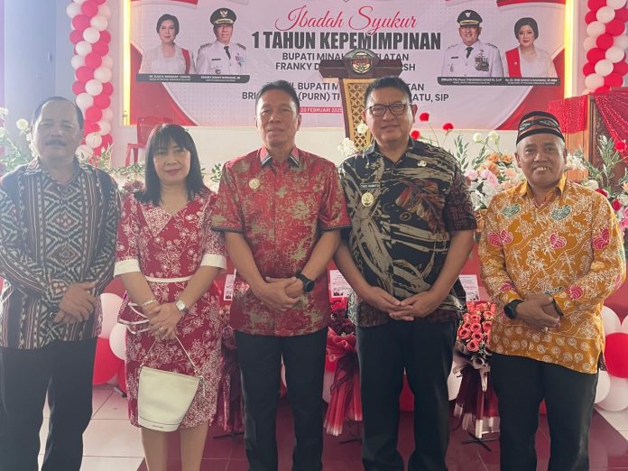 MINSEL – Bupati Minahasa Selatan Franky Donny Wongkar SH bersama Wakil Bupati Brigjen TNI (Purn) Theodorus Kawatu SIP menghadiri Ibadah Syukur dalam rangka 1 Tahun Kepemimpinan di Aula Waleta, Kantor Bupati Minahasa Selatan, Jumat.
